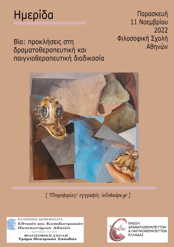Η Ένωση Δραματοθεραπευτών και Παιγνιοθεραπευτών Ελλάδας σε συνεργασία με το Τμήμα Θεατρικών Σπουδών του Εθνικού και Καποδιστριακού Πανεπιστημίου Αθηνών διοργανώνει ημερίδα με θέμα «Βία: προκλήσεις στη δραματοθεραπευτική και παιγνιοθεραπευτική διαδικασία», την Παρασκευή 11 Νοεμβρίου 2022 στο Αμφιθέατρο της Βιβλιοθήκης της Φιλοσοφικής Σχολής Αθηνών. Η επικαιρότητα μας επιβάλλει να στρέψουμε το βλέμμα προς τη βία που φαίνεται να κυριαρχεί τόσο στο κοινωνικό, πολιτικό, οικονομικό, όσο και στο φυλετικό και ψυχολογικό πεδίο. Η καθημερινότητά μας δέχεται συνεχείς επιθέσεις […]