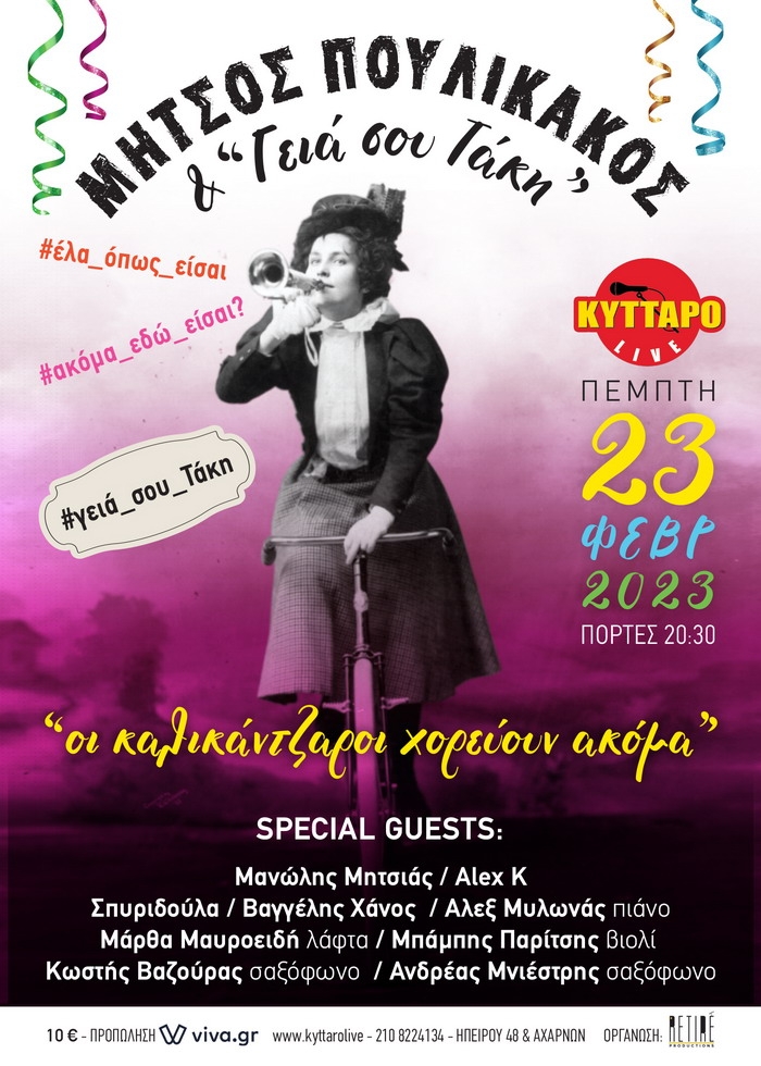 Μήτσος Πουλικάκοςκαι οι «Γεια σου Τάκη»#ΕΛΑ_ΟΠΩΣ_ΕΙΣΑΙ Μετά από τις 2 ειδοποιήσεις και 2 απανωτά SOLD OUTs, ακολουθεί η…3 η ΕΙΔΟΠΟΙΗΣΗ Ευτυχώς που ζούμε στον Παράδεισοευτυχώς που δεν πλαστήκαμε διαβόλοικι έτσι χαίρει και γελά η φύσις όλη Που λέτε, πέρα απ' όλα όσα βουρλίζουνε τη ζωή μας και την καθημερινότητά μας, αναρωτιέμαι, πουλάκια μου, μήπως και δεν σας βασανίσαμε αρκετά, στις 13 και 21 Γενάρη, όπου και μας τιμήσατε δεόντως, με […]