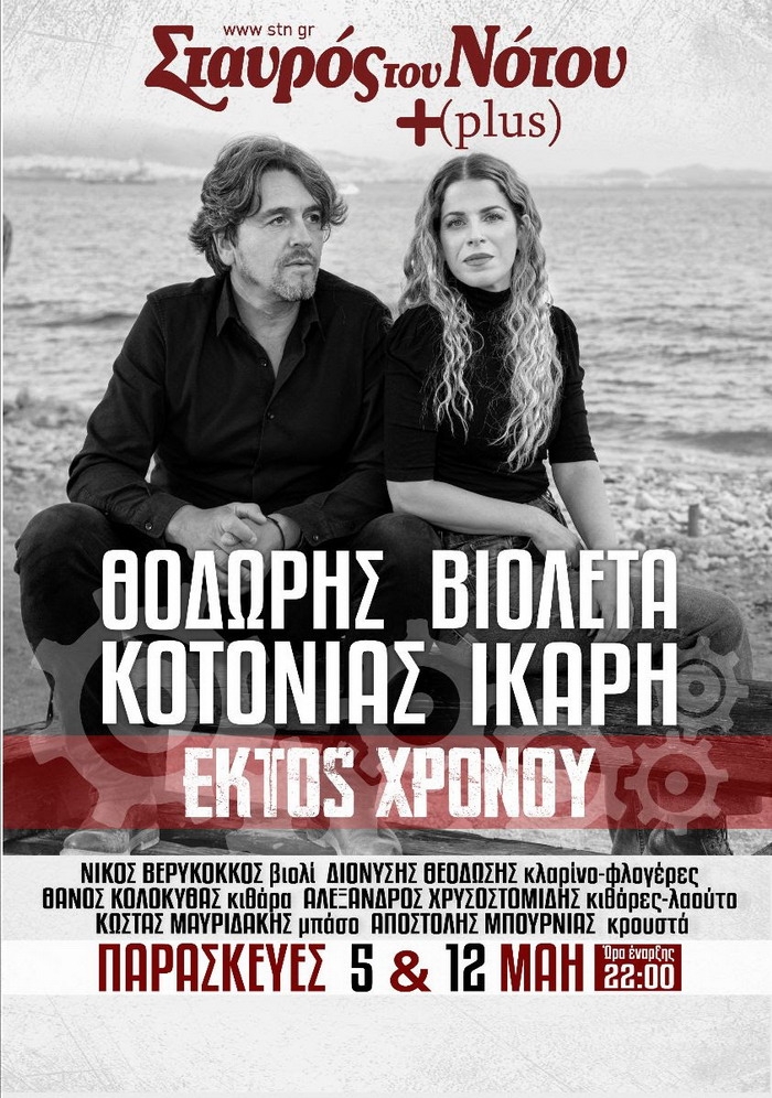 Στην εποχή που ο άνθρωπος γυρίζει σαν γρανάζι γύρω από τον εαυτό του στο ρολόι της ζωής, ο Θοδωρής Κοτονιάς και η Βιολέτα Ίκαρη μας προσκαλούν να σταματήσουμε για λίγο τη "μηχανή" και να βρεθούμε μαζί τους σε μαγικές στιγμές με τραγούδια που ζουν πάντα "Εκτός Χρόνου". Δυο καλλιτέχνες με ξεχωριστό ηχόχρωμα ευαισθησία και δύναμη που αγαπήθηκαν από το ευρύ κοινό για τα τραγούδια τις ερμηνείες και το ήθος τους. […]