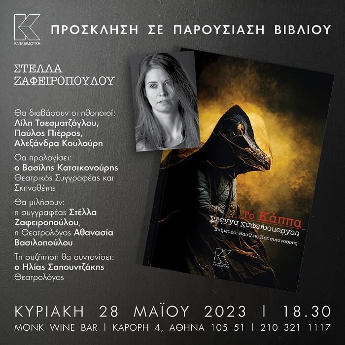 Η συγγραφέας Στέλλα Ζαφειροπούλου και η Κάπα Εκδοτική σας προσκαλούν στην παρουσίαση του βιβλίου με τίτλο: ΤΟ ΚΑΠΠΑ που θα πραγματοποιηθεί στο MONK Wine Bar, Καρόρη 4, Αθήνα 105 51, 21 0321 1117, την Κυριακή 28 Μαΐου 2023, στις 18.30 Θα διαβάσουν οι ηθοποιοί: Λίλη Τσεσματζόγλου, Παύλος Πιέρρος, Αλεξάνδρα Κουλούρη Θα προλογίσει: ο Βασίλης Κατσικονούρης Θεατρικός Συγγραφέας και Σκηνοθέτης Θα μιλήσουν: η Συγγραφέας Στέλλα Ζαφειροπούλου, η Θεατρολόγος Αθανασία Βασιλοπούλου Τη συζήτηση θα συντονίσει: o Ηλίας Σαπουντζάκης Θεατρολόγος ΕΙΣΟΔΟΣ ΕΛΕΥΘΕΡΗ Η συγγραφέας Στέλλα Ζαφειροπούλου και η Κάπα Εκδοτική σας προσκαλούν στην […]