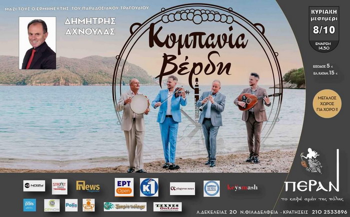 Ένα από τα αντιπροσωπευτικότερα σχήματα, που μεταφέρουν με καθαρότητα τα ηχοχρώματα της Ηπείρου, της περιοχής του Πωγωνίου και της ελληνικής βορείου Ηπείρου - η μουσική οικογένεια Βέρδη, θα συμπράξει καλλιτεχνικά με τον εξαιρετικό δημοτικό ερμηνευτή Δημήτρη Αχνούλα, την Κυριακή 8 Οκτωβρίου το μεσημέρι και ώρα 2.30, στο ΠΕΡΑΝ το καφέ αμάν της πόλης. Το σχήμα ιδρύθηκε τα τελευταία 12 χρόνια, λόγω του ότι εντάχθηκαν αυτοβούλως εκτός απ’ τον Κώστα και […]