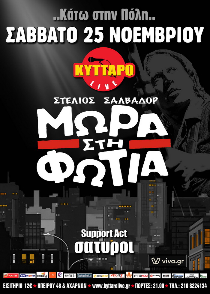 Support Act: ΣΑΤΥΡΟΙ Ο Στέλιος Σαλβαδόρ, τα Μωρά στη Φωτιά, μετά από τρία συνεχόμενα Sold Out στο Κύτταρο και το πρόσφατο συγκλονιστικό Live-Ξέσπασμα στην Τεχνόπολη, οπού χιλιάδες κόσμος έδωσε εκκωφαντικό παρών και απέδωσε δικαιοσύνη στην πιο σημαντική ροκ μπάντα των καιρών μας, το τελευταίο Σάββατο του Νοέμβρη, επιστρέφουν «Κάτω στην Πόλη», στην «έδρα» τους, στην ..Ηπείρου και Αχαρνών, εκεί που έχτισαν το σύγχρονο μύθος τους, εκεί που οι συναυλίες τους […]