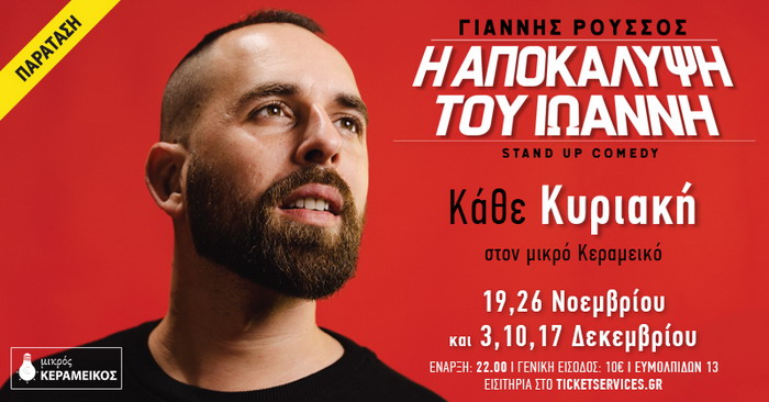 ΓΙΑΝΝΗΣ ΡΟΥΣΣΟΣ Η ΑΠΟΚΑΛΥΨΗ ΤΟΥ ΙΩΑΝΝΗ Stand up comedy Παράταση παραστάσεων από την Κυριακή 19 Νοεμβρίου Και κάθε Κυριακή στις 22:00 για περιορισμένο αριθμό παραστάσεων Στον Μικρό Κεραμεικό παρατείνεται ύστερα από τις sold out παραστάσεις η Stand Up Comedy «Η ΑΠΟΚΑΛΥΨΗ ΤΟΥ ΙΩΑΝΝΗ» του Γιάννη Ρούσσου από την Κυριακή 19 Νοεμβρίου και κάθε Κυριακή στις 22:00 για περιορισμένο αριθμό παραστάσεων. - Γιάννη πήγαινε πάρε 1 κιλό μοσχαρίσιο κιμά. - Ναι […]
