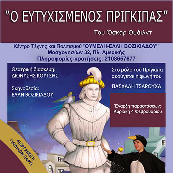 Μία παρέα νέων παιδιών με τη θεία τους φτάνουν σε μία άγνωστη πόλη για τουρισμό. Στην κεντρική πλατεία αντικρίζουν ένα μνημείο με ένα επίγραμμα που τους κινεί το ενδιαφέρον: «Στη θέση αυτή βρισκόταν κάποτε το άγαλμα ενός πρίγκιπα ο οποίος ζούσε ευτυχισμένος και απομονωμένος στο παλάτι του και δεν ήξερε τι θα πει πόνος και δάκρυ». Κι έτσι η ιστορία μας αρχίζει….. Στη σκηνή προβάλλει το εντυπωσιακό χρυσό άγαλμα του […]