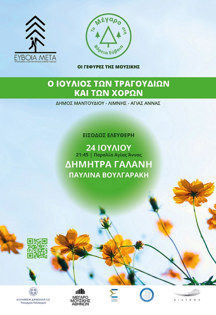 Στο πλαίσιο του Φεστιβάλ «Ο Ιούλιος των τραγουδιών και των χορών» (20–24 Ιουλίου) και του προγράμματος «Το Μέγαρο στη Βόρεια Εύβοια–Οι Γέφυρες της Μουσικής» Με τη μεγάλη συναυλία της Δήμητρας Γαλάνη στην υπέροχη παραλία της Αγίας Άννας, την Τετάρτη 24 Ιουλίου (ώρα έναρξης: 21.45), ολοκληρώνεται ο φετινός «Ιούλιος των τραγουδιών και των χορών» του Μεγάρου Μουσικής Αθηνών στη Βόρεια Εύβοια. To πρόγραμμα των εκδηλώσεων επανέρχεται τον Σεπτέμβριο και θα διαρκέσει […]