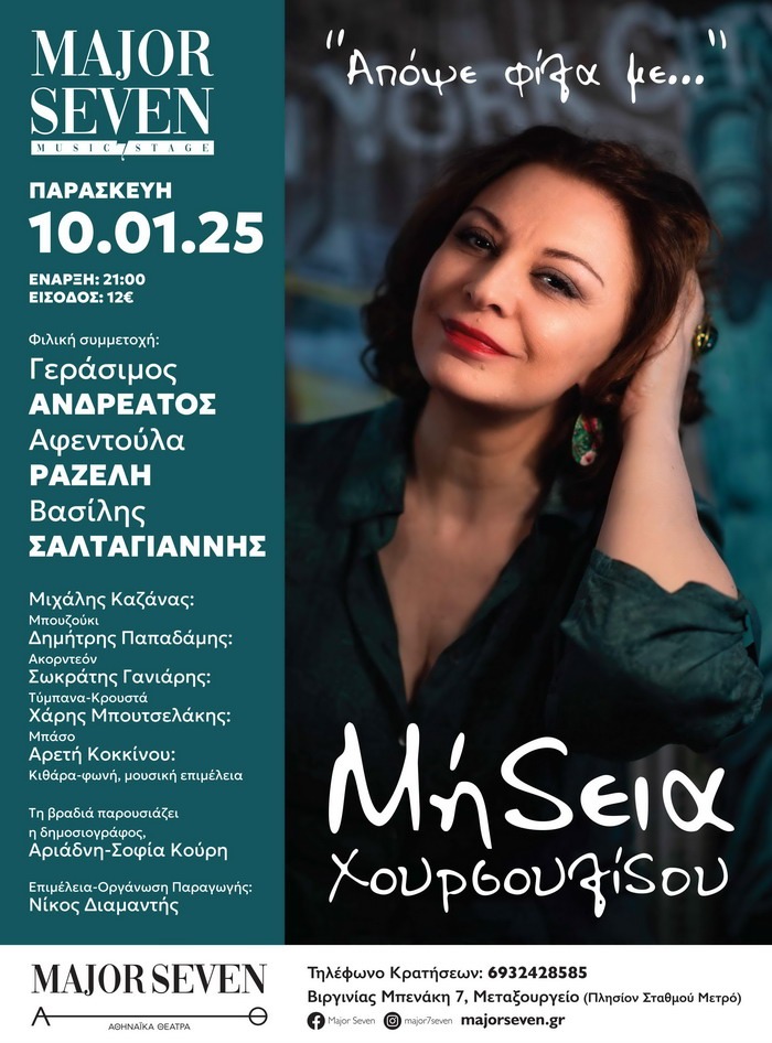 Η σπουδαία ερμηνεύτρια Μήδεια Χουρσουλίδου και οι συνεργάτες της, την Παρασκευή 10 Ιανουαρίου στις 21:00, ανεβαίνουν στη σκηνή του Major Seven Music Stage και μας ταξιδεύουν για πρώτη φορά στη χρυσή εποχή του λαϊκού μας τραγουδιού, ερμηνεύοντας σημαντικά τραγούδια των μεγάλων λαϊκών δημιουργών της δεκαετίας του '50 και του '60, παρέα με τους εκλεκτούς της προσκεκλημένους, Γεράσιμο Ανδρεάτο και τον Βασίλη Σαλταγιάννη. Λίγα λόγια για την ερμηνεύτρια Η Μήδεια Χουρσουλίδου τα […]