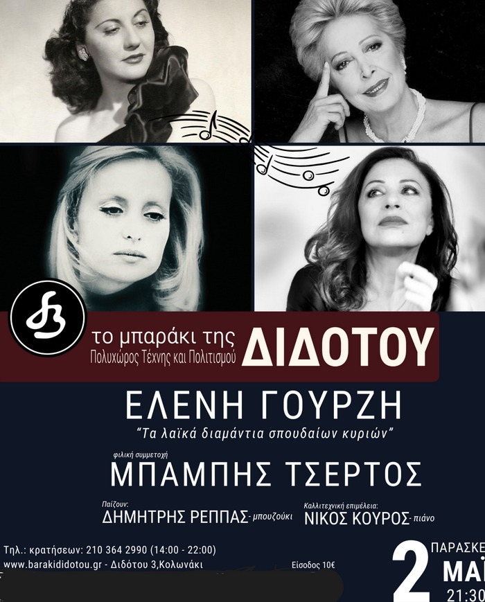 Η χαρισματική ερμηνεύτρια Ελένη Γουρζή συνεχίζει τις προσωπικές της εμφανίσεις,με επόμενο σταθμό το μπαράκι της Διιδότου, την Παρασκευή 2 Μαΐου,στις 21:30. «Τα λαϊκά διαμάντια σπουδαίων κυριών» ο τίτλος της παράστασης ,στην οποία η Ελένη Γουρζή θα ερμηνεύσει λαϊκά τραγούδια που αγαπήσαμε και λατρέψαμε απο τις φωνές των σπουδαίων γυναικών: Σοφία Βέμπο,Πόλυ Πάνου,Βίκυ Μοσχολιού και Χαρούλα Αλεξίου . Ένα μοναδικό αφιέρωμα σε τέσσερις γυναίκες που άφησαν ιστορία στο ελληνικό πεντάγραμμο, καθεμιά […]