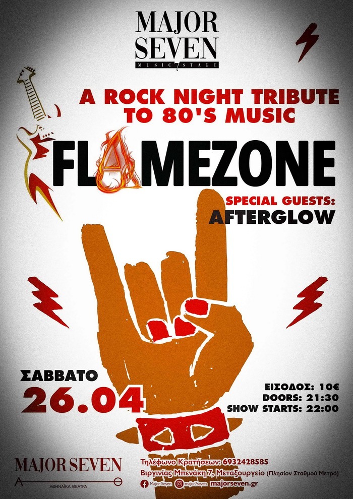 Το Σάββατο 26 Απριλίου οι Flamezone ανεβαίνουν στην μουσική σκηνή του Major Seven. Οι Flamezone είναι μία cover band που αποτελείται από έμπειρους μουσικούς από τη συμμετοχή τους σε άλλα μουσικά σχήματα, και δημιουργήθηκαν για να παρουσιάσουν στο κοινό αγαπημένα τραγούδια από προηγούμενες δεκαετίες, κυρίως την αγαπημένη δεκαετία του ’80. Σαν Special Guests, τη βραδιά θα ανοίξουν οι Afterglow, οι οποίοι θα μας ταξιδέψουν με κλασικές επιτυχίες σε ροκ-ποπ ύφος […]