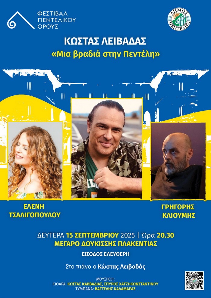 Ο ΚΩΣΤΑΣ ΛΕΙΒΑΔΑΣ ΣΤΟ ΦΕΣΤΙΒΑΛ ΠΕΝΤΕΛΙΚΟΥ ΟΡΟΥΣ ΜΑΖΙ ΜΕ ΤΗΝ ΕΛΕΝΗ ΤΣΑΛΙΓΟΠΟΥΛΟΥ & ΤΟΝ ΓΡΗΓΟΡΗ ΚΛΙΟΥΜΗ – ΔΕΥΤΕΡΑ 15 ΣΕΠΤΕΜΒΡΙΟΥ 2025