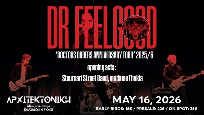 Σάββατο 16 Μαίου 2026 APXITEKTONIKH CLUB LIVE STAGE Ελασιδών 6, Γκάζι – Αθήνα Opening Acts: Stournari Street Band Special After-Show DJ Set: Madame Θέκλα (Θέκλα Τσελεπή) Η Αρχιτεκτονική Club Live Stage υποδέχεται το Σάββατο 16 Μαίου 2026 ένα από τα πιο εμβληματικά συγκροτήματα της βρετανικής rock & rhythm’n’blues σκηνής: τους θρυλικούς Dr Feelgood. Με διεθνείς περιοδείες, αμέτρητες συναυλίες και έναν κατάλογο γεμάτο κλασικά κομμάτια, οι Dr Feelgood παραμένουν ένα ζωντανό […]