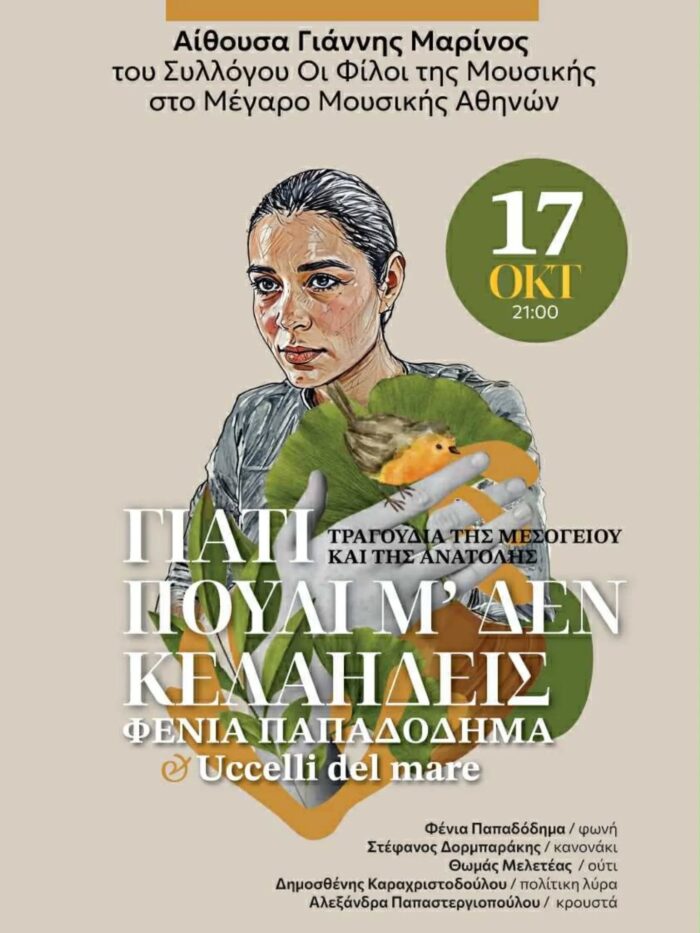 Τραγούδια της Μεσογείου και της Ανατολής: σεφεραδίτικα, chansons trouvères, cantates, γκαζέλ, αμανέδες, romances Η Φένια Παπαδοδήμα παρουσιάζει ένα μοναδικό μουσικό ταξίδι στις παραδόσεις της Μεσογείου και της Ανατολής με το πρόγραμμα «Uccelli del mare», την Παρασκευή 17 Οκτωβρίου στις 21.00 στην Αίθουσα Γιάννης Μαρίνος του Συλλόγου «Οι Φίλοι της Μουσικής» στο Μέγαρο Μουσικής Αθηνών. Την συνοδεύουν οι ταλαντούχοι μουσικοί μουσικοί, Στέφανος Δορμπαράκης στο κανονάκι, Θωμάς Μελετέας στο ούτι, Δημοσθένης Καραχριστοδούλου […]