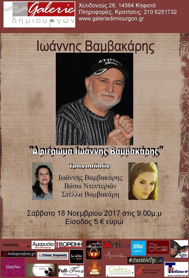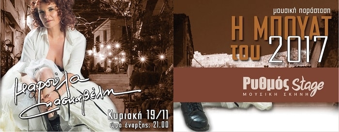 «Η Μπουάτ του 2017» Η Μαρούλα Κασκαβέλη σε μια μουσική παράσταση με αφήγηση, τραγούδια video στη Μουσική Σκηνή Ρυθμός Stage Κυριακή 19 Νοεμβρίου 2017 Μισό αιώνα μετά την εποχή των Μπουάτ, η ανάγκη μας να γίνουμε «μια φωνή» δείχνει μεγαλύτερη από ποτέ. Τότε, σε κείνα τα παραμυθένια καμαράκια της Πλάκας, μαζεύονταν μικρές παρέες καθημερινών ανθρώπων, πάνω σε ψάθινες καρέκλες καφενείου ή καταγής, πάνω σε στρωμένες βελέτζες, με χαμηλό φωτισμό και […]