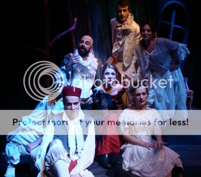 Είναι : Μαριάνθη Σοντάκη (μοιραία και απαρηγόρητη Contesa Olympia Caramella), Ελεάννα Φινοκαλιώτη (οικονόμος Ντορίνα, επιρρεπής στο λάδωμα), Ειρήνη Αμπουμόγλι (Γκίτα, γενικών καθηκόντων), Νίκος Καραστέργιος (Τσέκο, επίσης γενικών καθηκόντων), Γιάννης Βλαχογιάννης (επιστάτης Μπρουνόρο, επίσης επιρρεπής στο λάδωμα), Λεωνίδας Μαράκης (Conte Caramella, τάχα Νεκρομάντης), Χρήστος Χριστόπουλος (Μαρκήσιος και επαγγελματίας εραστής)